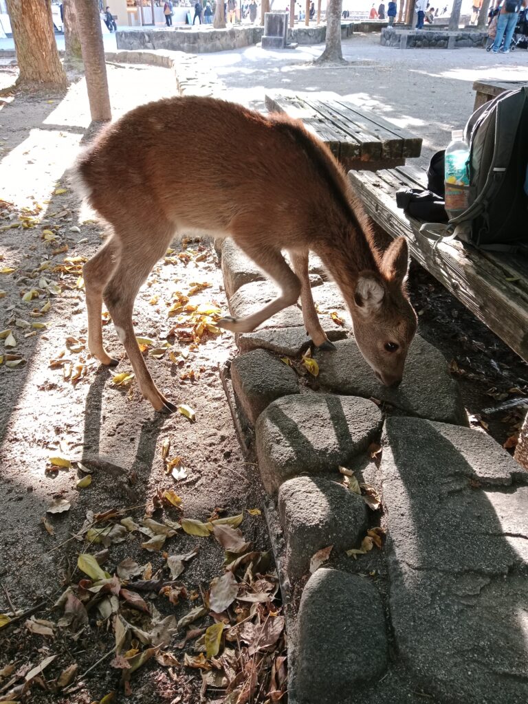 Ein weiteres charmantes Merkmal Miyajimas sind die frei herumlaufenden Rehe. Sie gelten als heilige Tiere und bewegen sich ganz selbstverständlich zwischen Tempeln, Geschäften und Besuchern. Oft kommen sie neugierig näher, weshalb man Taschen und Karten gut festhalten sollte. Trotz ihrer Zutraulichkeit sollte man sie respektvoll behandeln und nicht füttern.