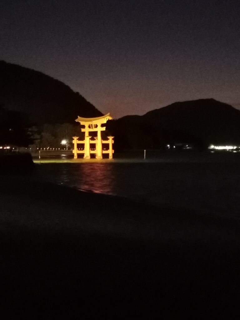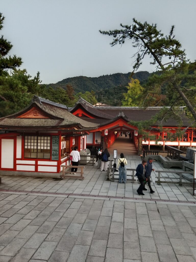 Die Anreise nach Miyajima ist bereits ein besonderes Erlebnis. Von Hiroshima aus fährt man zunächst mit dem Zug bis Miyajimaguchi und steigt dort auf eine Fähre um. Die etwa zehnminütige Überfahrt bietet einen herrlichen Blick auf das Meer und – bei klarer Sicht – schon aus der Ferne auf das berühmte rote Torii im Wasser. Während sich die Fähre der Insel nähert, wächst die Vorfreude auf die besondere Stimmung dieses Ortes.